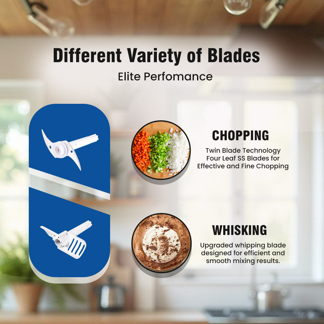 - Quality: Comes with a Rust resistant stainless steel twin blades for chopping onions, capsicum, tomatoes, cabbage, nuts etc. A whisker disc to make frothy batters, beating eggs & creams.