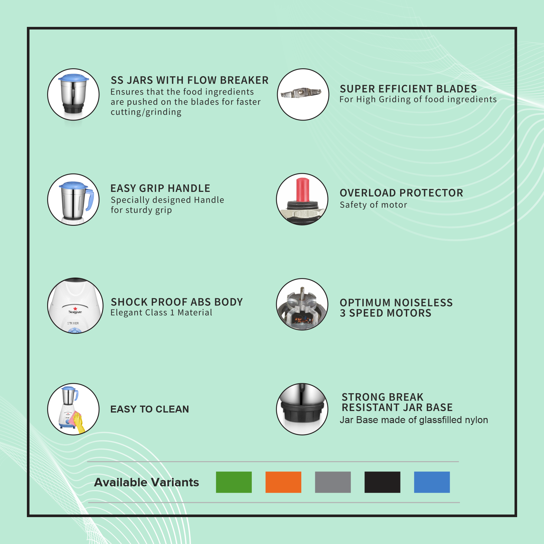 - Features: stargaze mixer is known for durability and trouble-free performance stargaze smasher+ mixer has a quality rated ISI certified durable motor for long life, it is a 550w mixer grinder that is elegant, compact lightweight, and easy to use, it comes with a fast and ensures efficient grinding durable stainless steel jars, it comes with multiple sizes 3 jars for meeting all your grinding needs, chef 550-watt mixer grinder is useful for wet and dry grinding, churning Grating, mincing, and chopping requirements, it has durable nylon couplers.